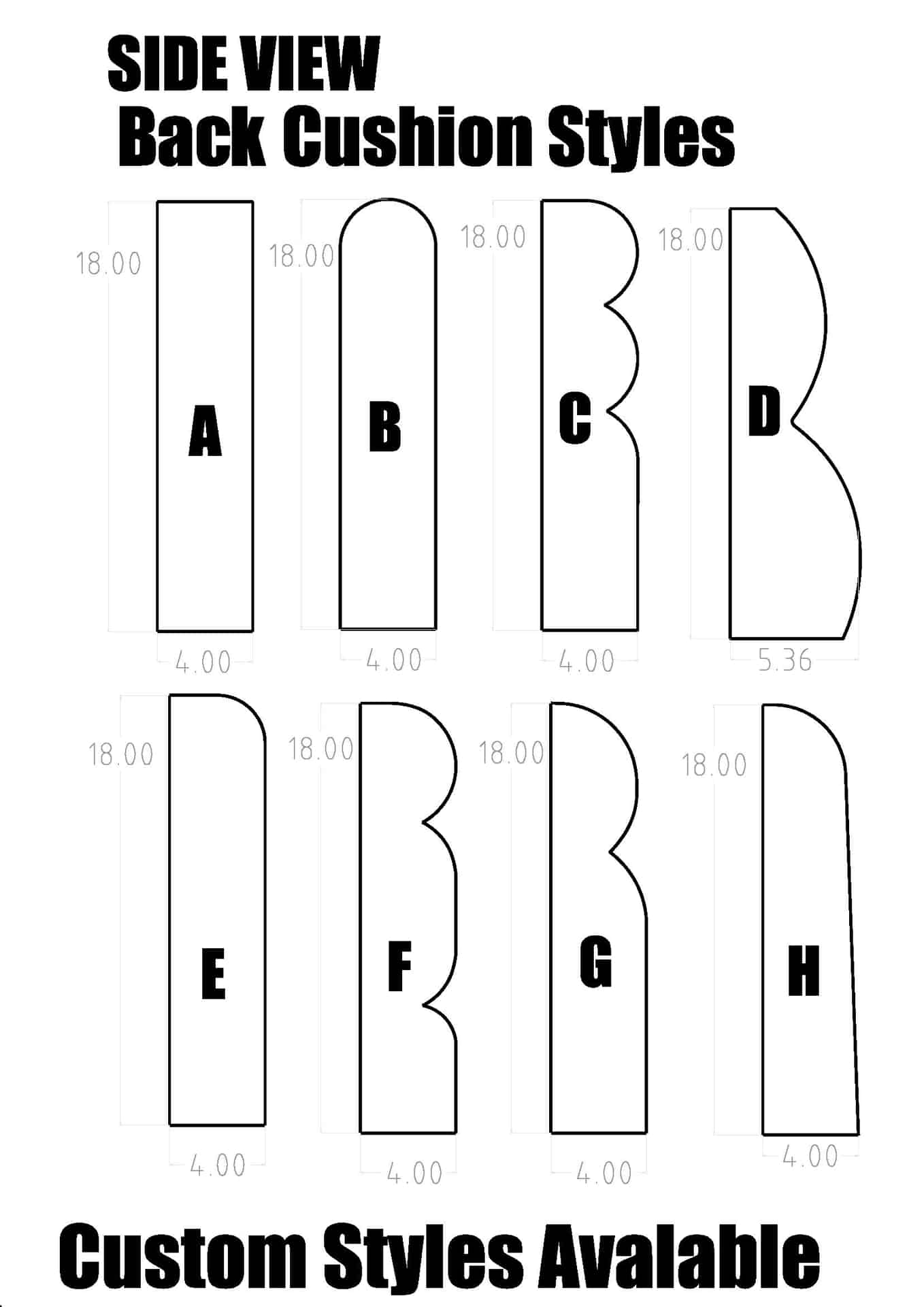 Back Cushion size stays the same 18″ tall x 4″ wide and you have 7 different styles to choose from.