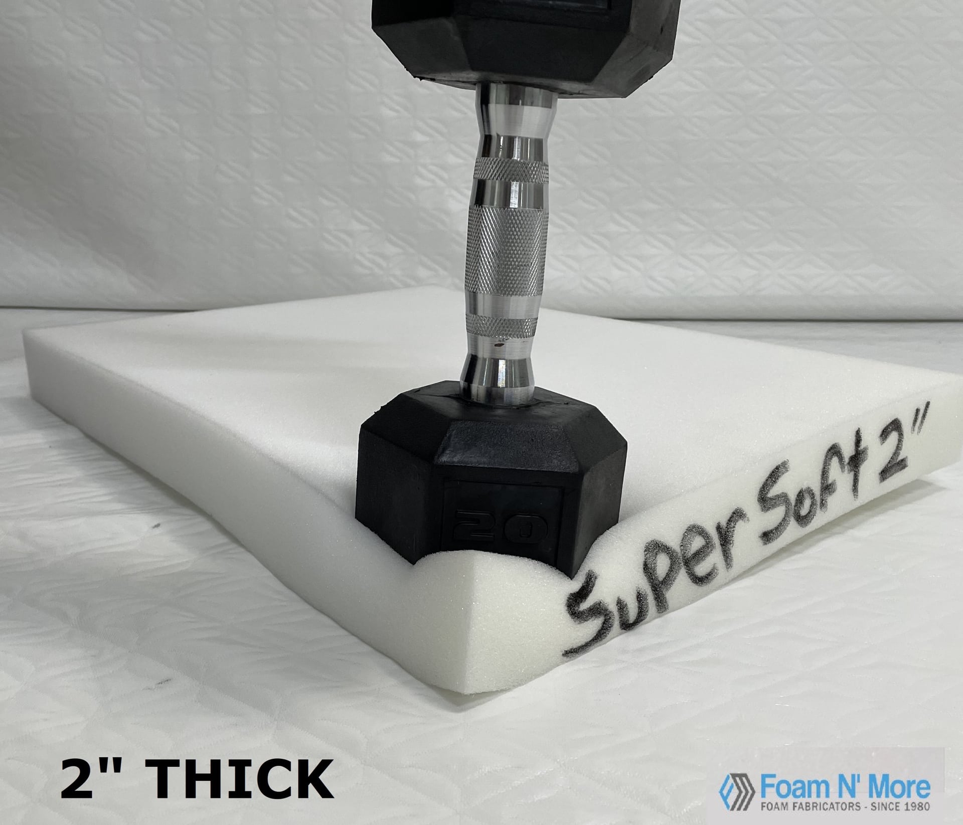 Our Standard Plush/Soft foam also known as Super Soft foam is not high density or rubber-based, so it is intended for temporary or lightweight usage only. This foam is a soft density foam type and is primarily found in sofa back cushions, baby mattresses, temporary mattress toppers, light upholstery projects, fold-out beds, and arts and crafts. This foam is not recommended for long-term use as it will break down and will need to be replaced much quicker than high-density foam. Our Plush/Soft Foam has a soft density. It’s recommended for temporary use on guest beds, fold-out beds, light upholstering of back cushions, camping uses, packaging, and arts & crafts.